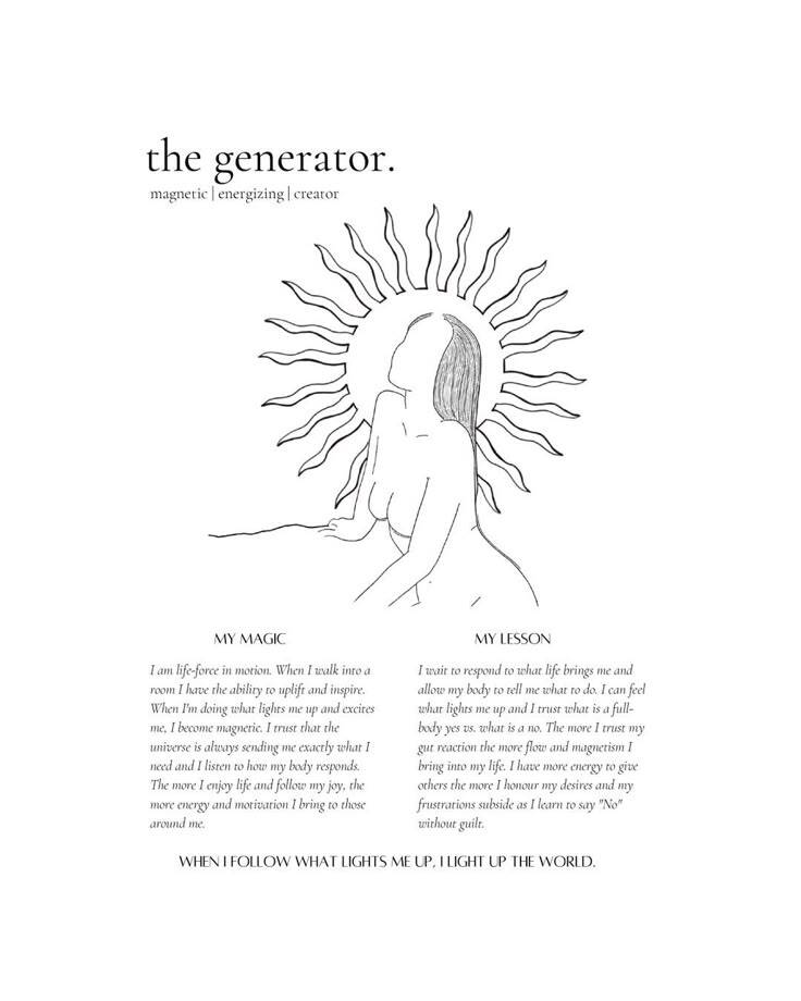 If you are a Generator, embrace the beauty of your design. Your energy is a gift, and when used correctly, you have the power to build, create, and sustain greatness. Trust the process, wait for what’s right, and respond with your gut. When you do, life will unfold in the most fulfilling and magical way.